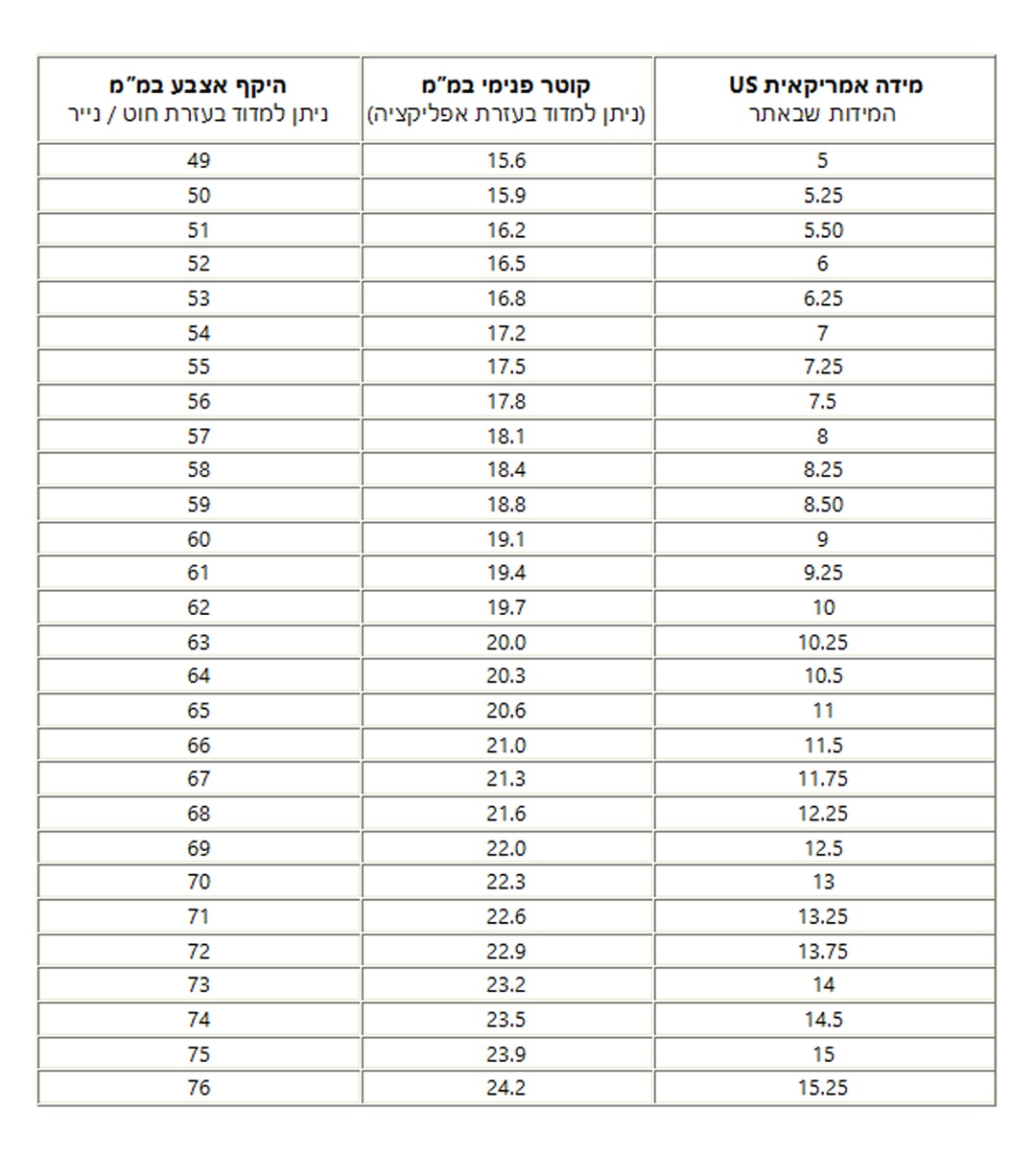 - המידה שתופיע על המסך, היא המידה שלכם. (שורת הטבלה בשם US/CA אלו המידות שלנו שמופיעות באתר)