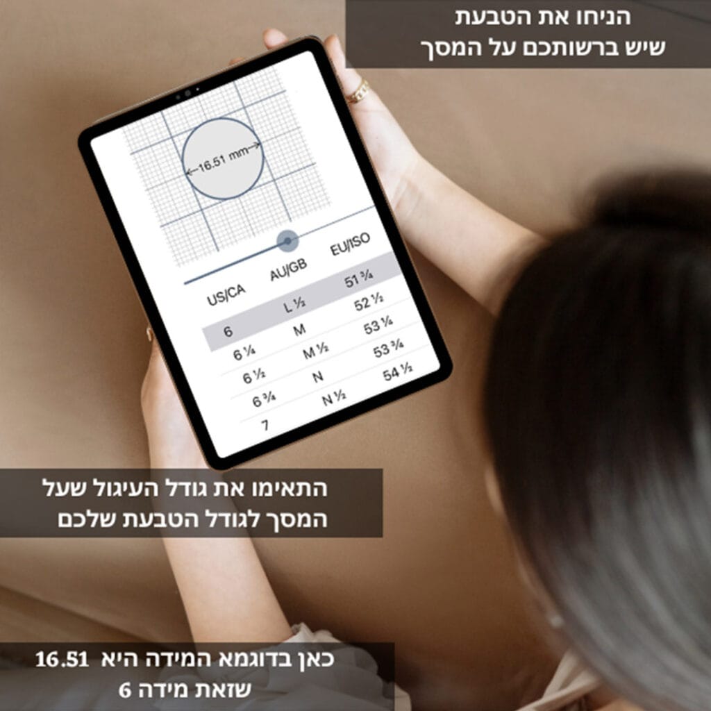 פעל על פי ההוראות באפליקציה – הנח את הטבעת על המסך, התאם את גודל העיגול לטבעת שלך והאפליקציה תזהה במדויק את המידה של