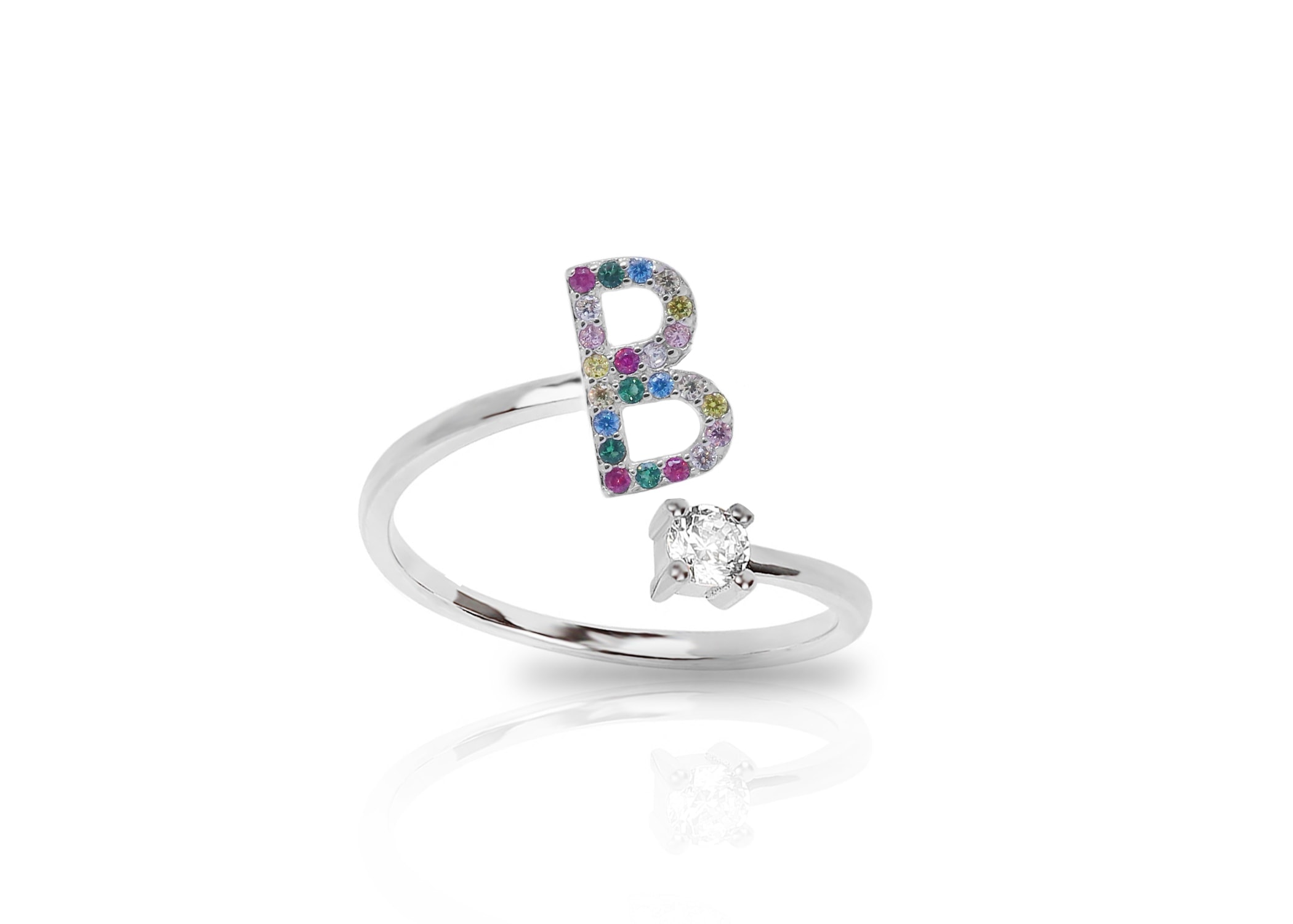 טבעת אות B משובצת זירקונים צבעוניים מכסף 925 טהור לאישה. הטבעת משובצת בזירקוני AAAA בחיתוך יהלום. הטבעת ניתנת להקטנה והגדלה לפי מידת האצבע. מצופה ברודיום להגנה מפני התחמצנות ושריטות. המוצר מגיע באריזת מתנה מהודרת וממותגת! חצי שנה אחריות.