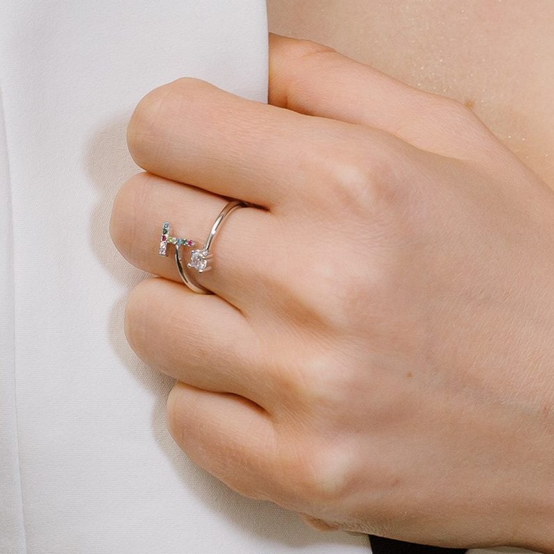 טבעת אות T משובצת זירקונים צבעוניים