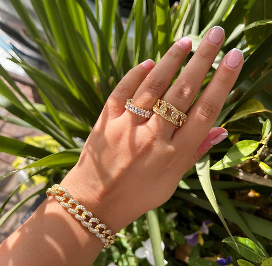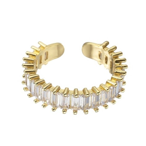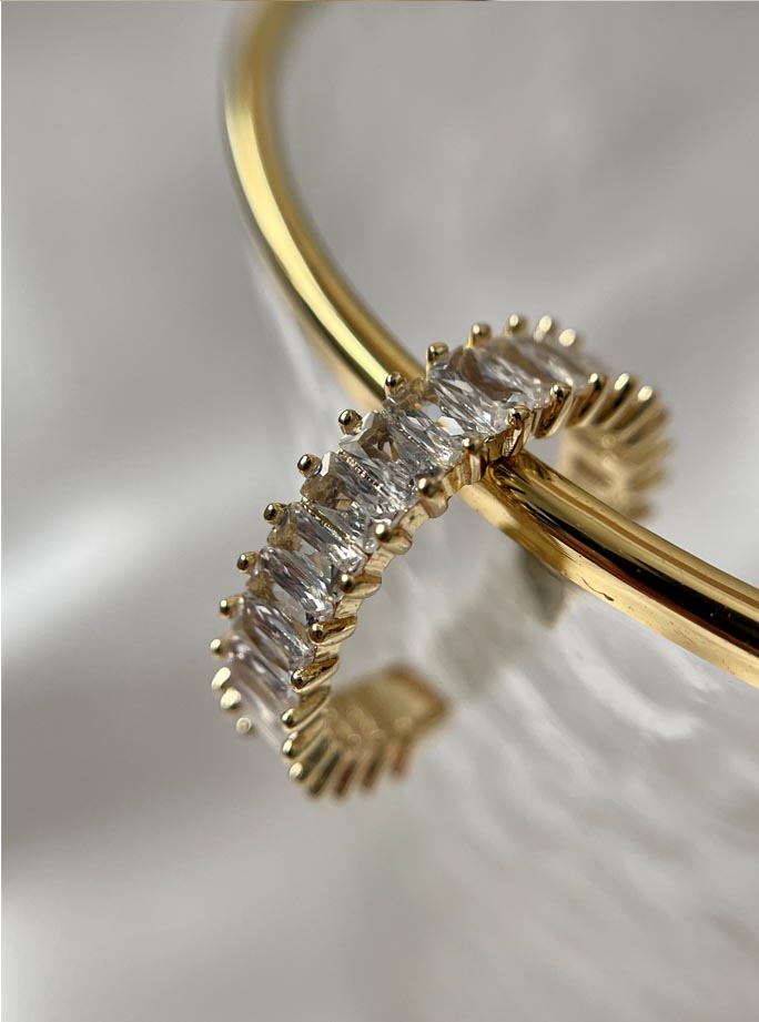 טבעת בגטים פתוחה משובצת בבגטים, הטבעת עשויה מציפוי זהב לאישה. הטבעת משובצת בזירקוני AAAA בחיתוך יהלום. המוצר מגיע באריזת מתנה מהודרת וממותגת! חצי שנה אחריות.