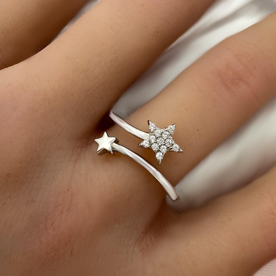 טבעת כוכבים גמישה, כוכב משובץ זירקונים מכסף 925 טהור לאישה. הטבעת משובצת בזירקוני AAAA בחיתוך יהלום. מצופה ברודיום להגנה מפני התחמצנות ושריטות. המוצר מגיע באריזת מתנה מהודרת וממותגת! חצי שנה אחריות.