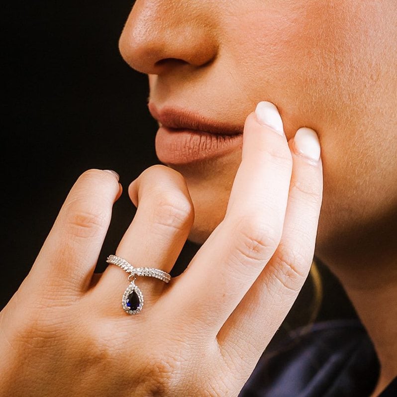 טבעת עם אלמנט טיפה נופל משובצת זרקן כחול וזירקונים