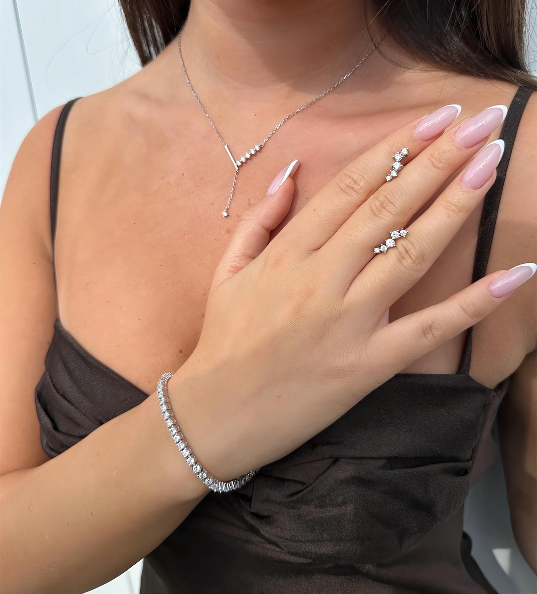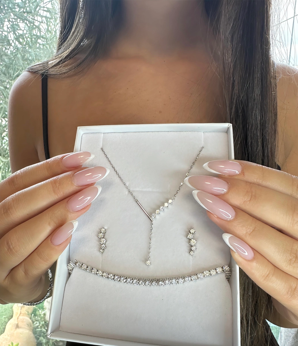 שילוב הרמוני של שרשרת עניבה עדינה, עגילים צמודים קלאסיים ו־צמיד טניס גמיש עם הארכה.