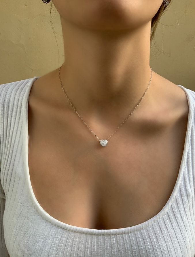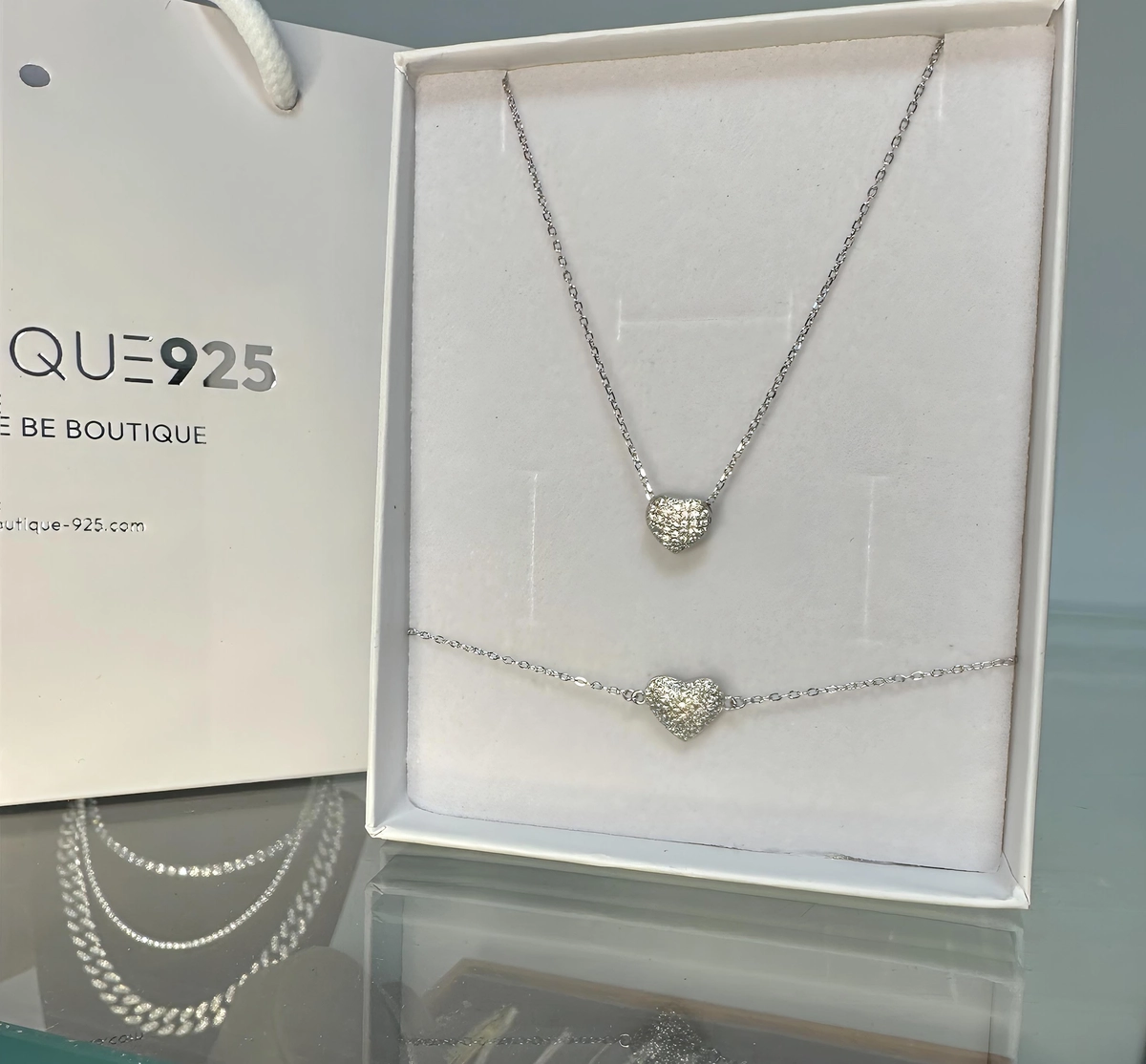 הסט עשוי כסף 925 משובץ זירקונים .שרשרת לב וצמיד לב באלמנטים שונים.