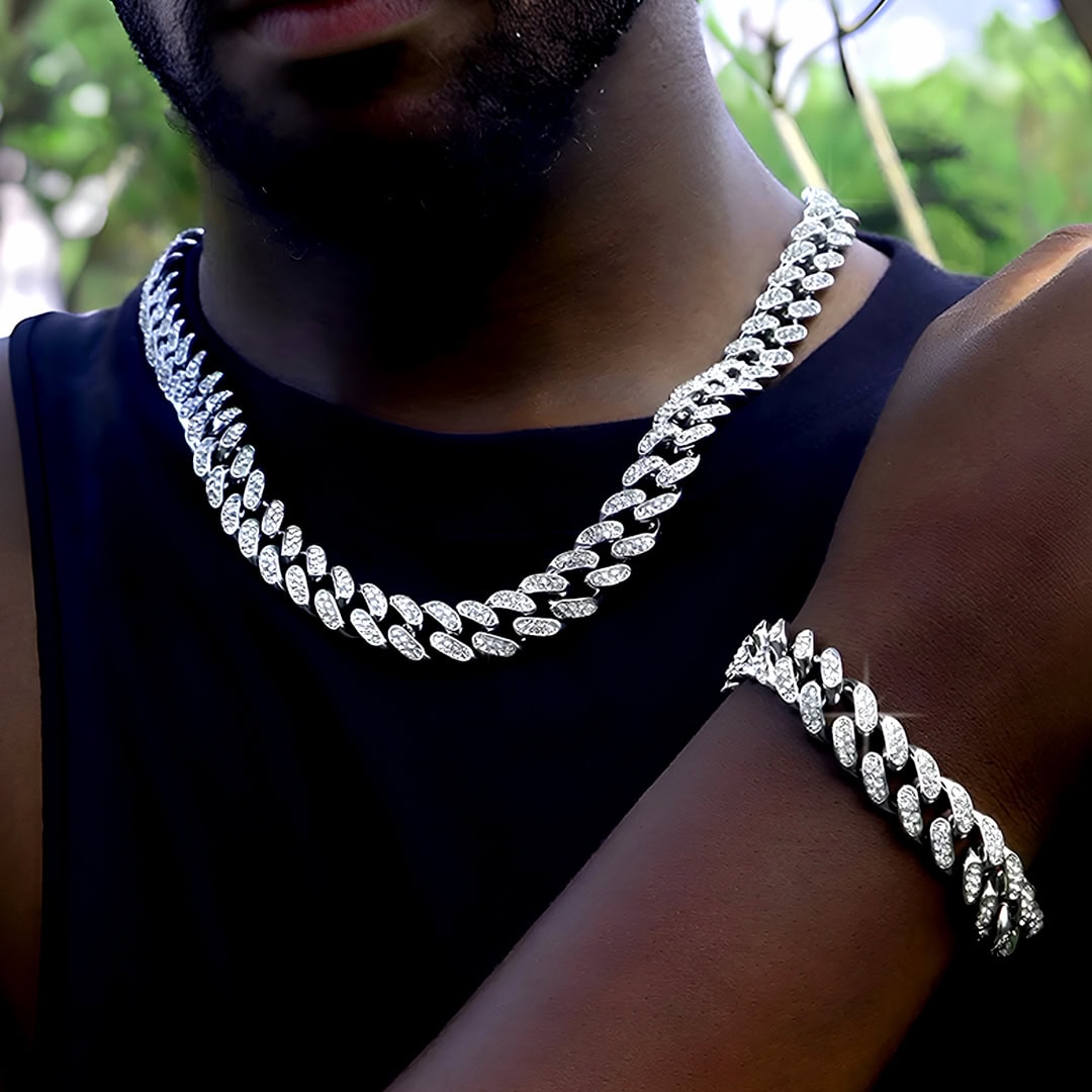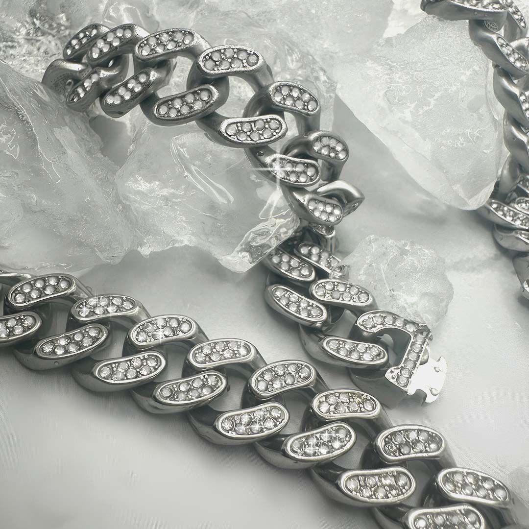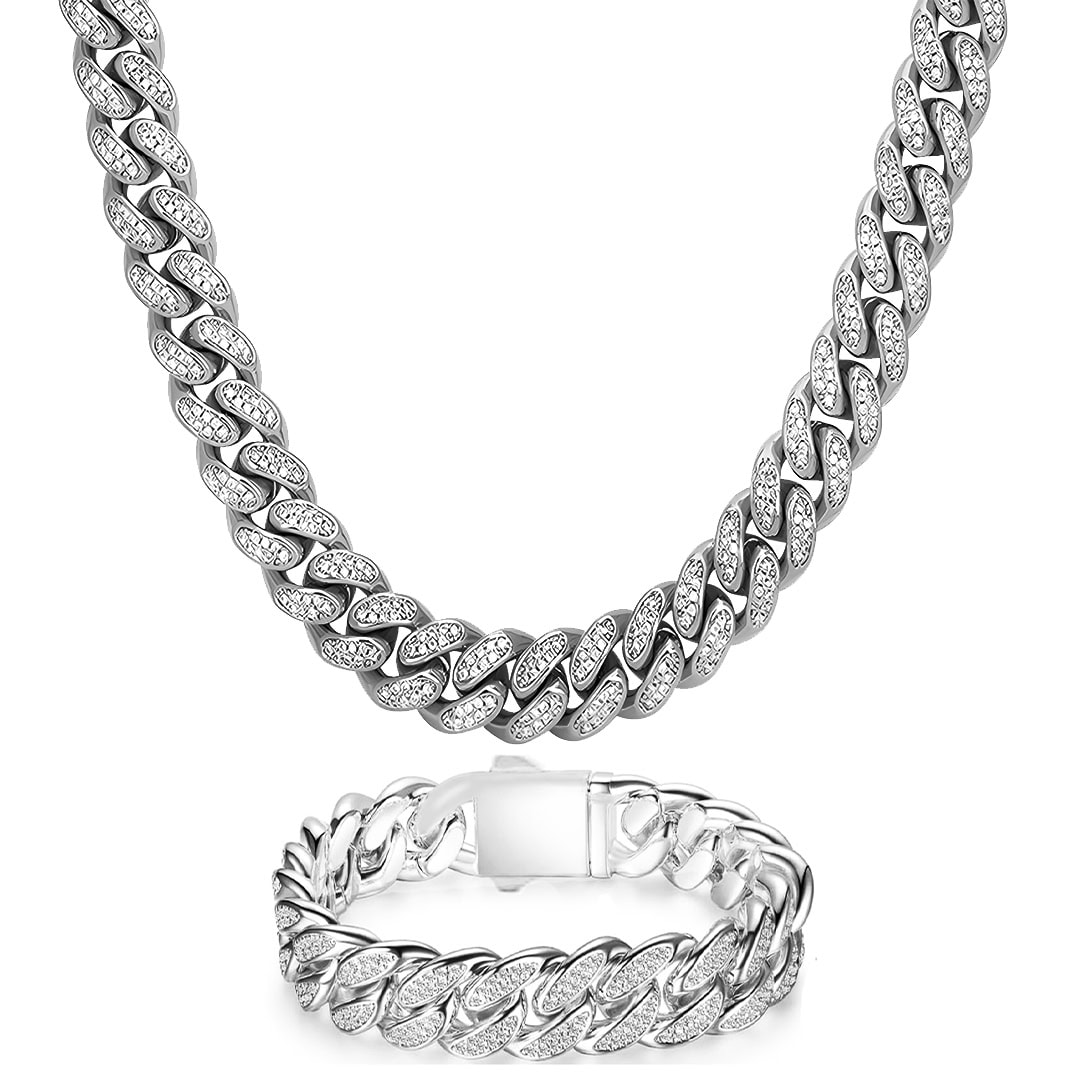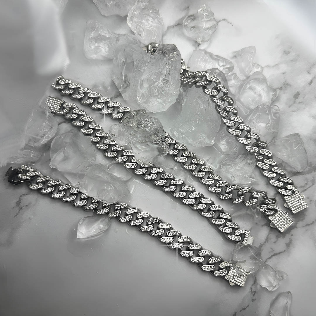 סט שרשרת וצמיד גורמט אייס משובצים זירקונים. לצמיד יש סוגר חזק עם חוליות נעימות למגע שמשובצות בזירקונים מבריקים.