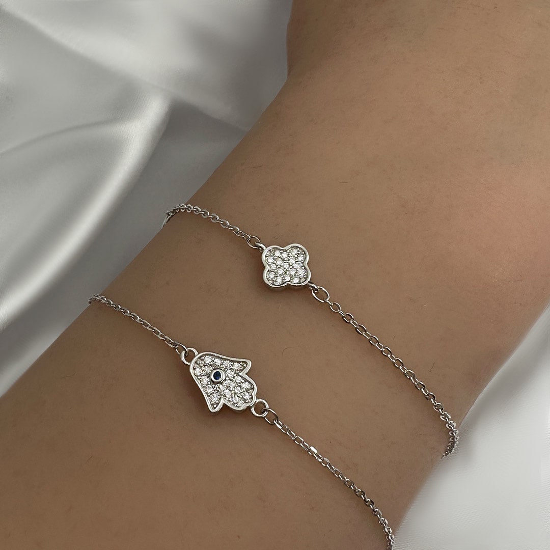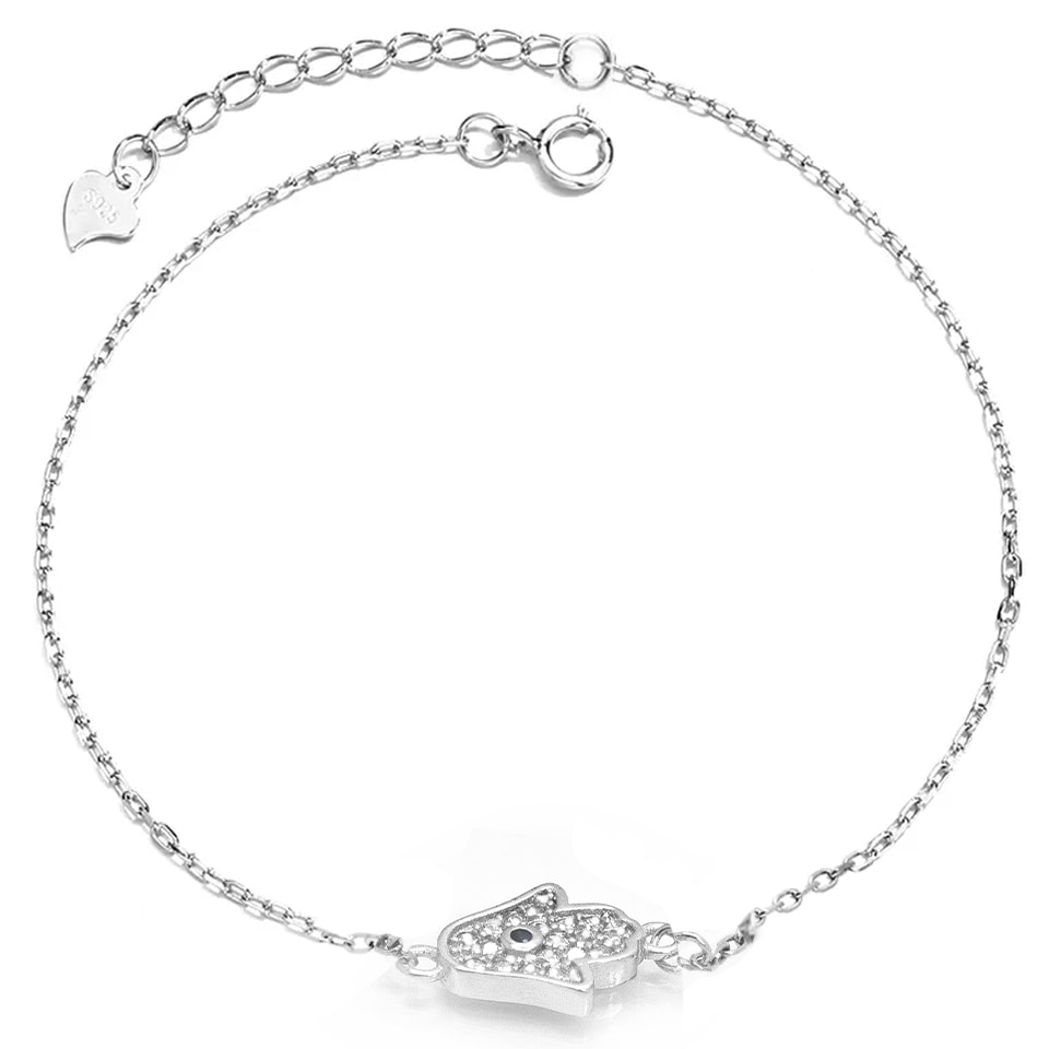 צמיד חמסה משובץ זירקונים מכסף 925 טהור לאישה. הצמיד משובץ בזירקוני AAAA בחיתוך יהלום. מצופה ברודיום להגנה מפני התחמצנות ושריטות. המוצר מגיע באריזת מתנה ממותגת ומהודרת! חצי שנה אחריות.