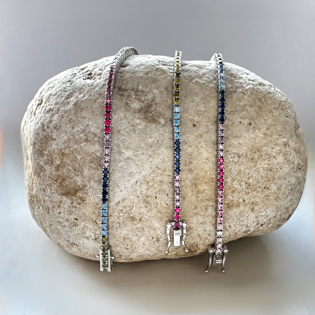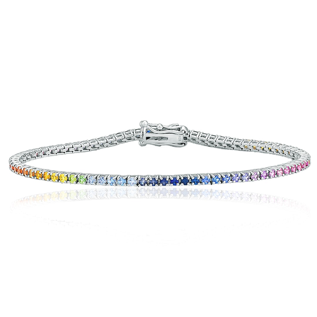 צמיד טניס ריינבואו מכסף 925 טהור. שיבוץ צבעוני בגודל 2 מ”מ באיכות AAAA בחיתוך יהלום Round Brilliant שמאפשר למקסם את ניצוץ וברק הזירקון.