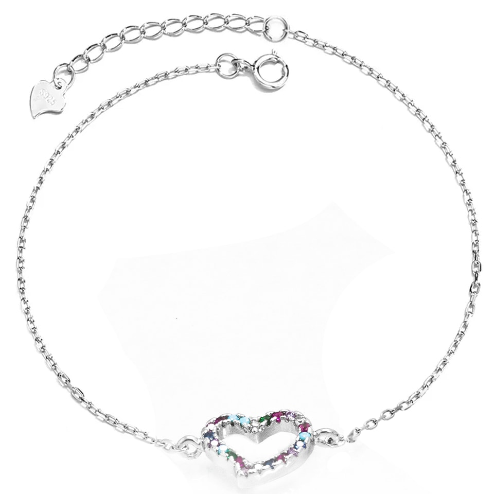 צמיד לב קולקציית ריינבו משובץ זירקונים מכסף 925 טהור לאישה. הצמיד משובץ בזירקוני AAAA בחיתוך יהלום. מצופה ברודיום להגנה מפני התחמצנות ושריטות. המוצר מגיע באריזת מתנה ממותגת ומהודרת! חצי שנה אחריות.