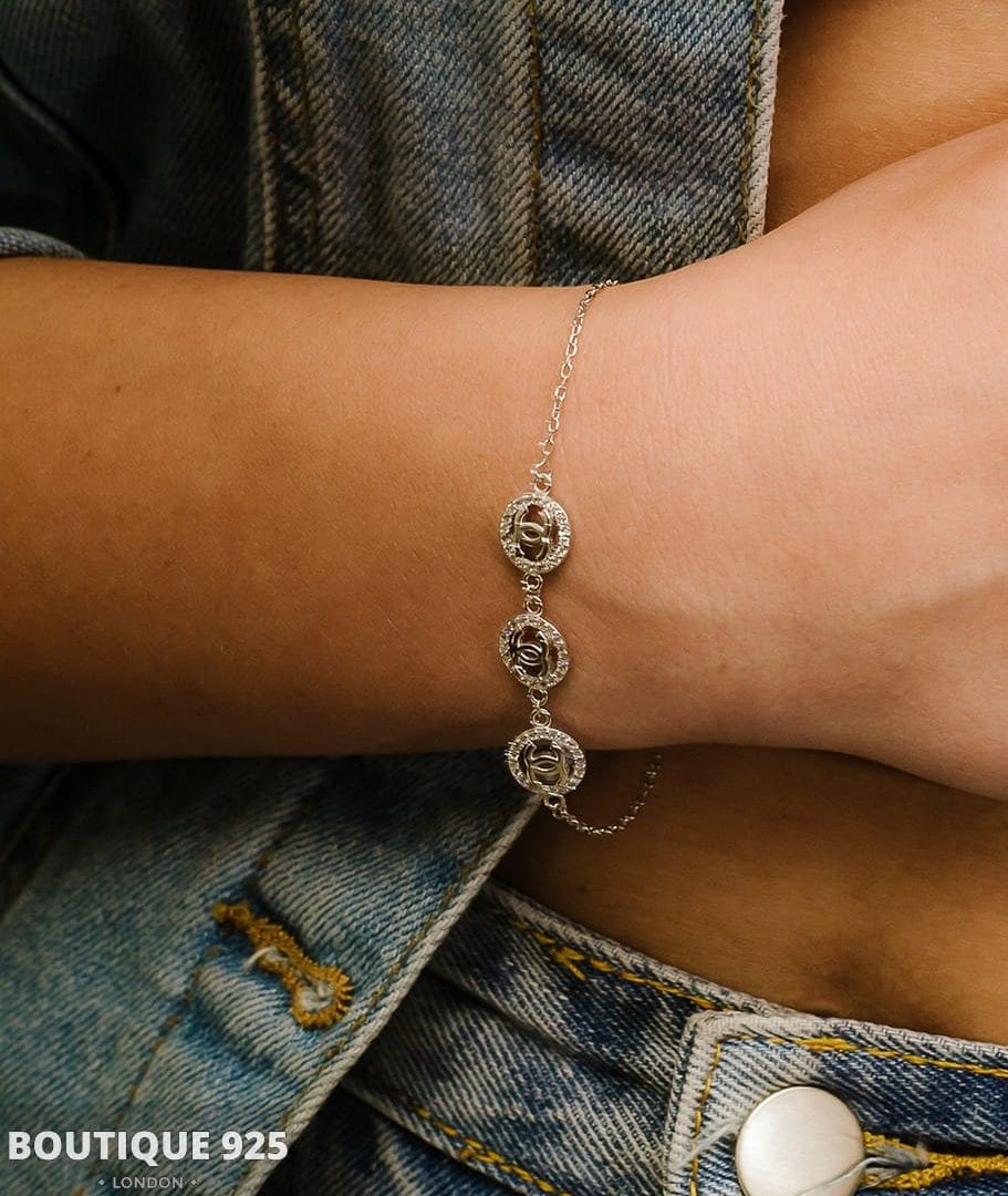 צמיד עם שלושה אלמנטים עגולים משובץ זירקונים מכסף 925 טהור לאישה. הצמיד משובץ בזירקוני AAAA בחיתוך יהלום. מצופה ברודיום להגנה מפני התחמצנות ושריטות. המוצר מגיע באריזת מתנה ממותגת ומהודרת! חצי שנה אחריות.