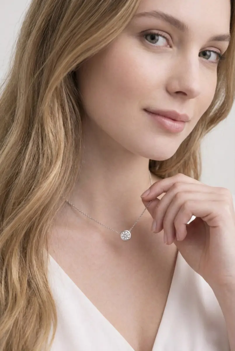 שרשרת סוליטר מואסנייט בעיצוב מודרני ונקי. התליון כולל אבן איכותית בדרגת D Color VVS1 המשובצת במסגרת בזל חלקה שמעניקה מראה מרחף ומדויק על הצוואר.